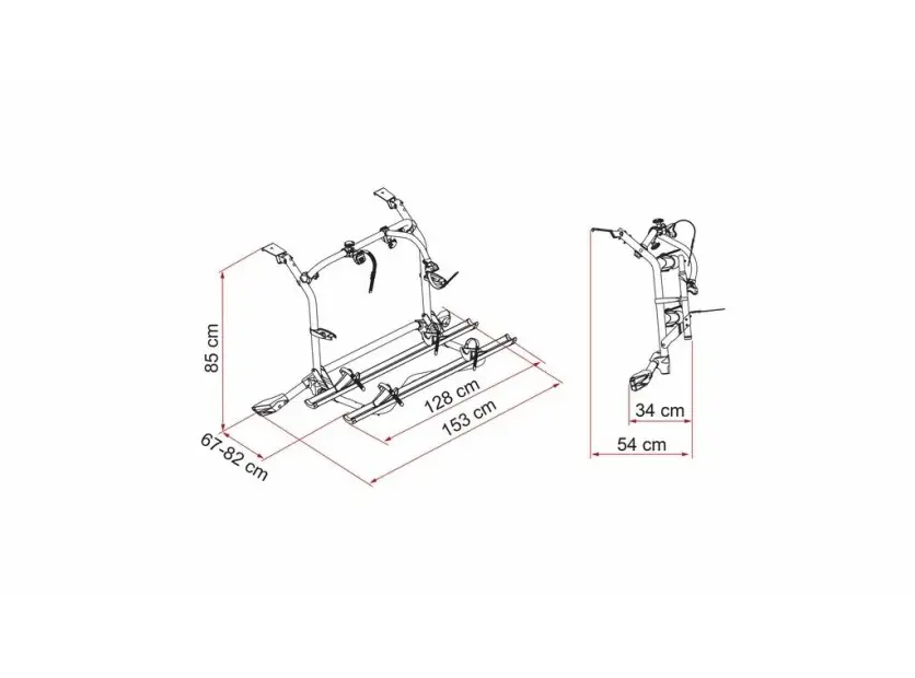Dimensions adaptées au T5 : avec 128 cm de large, 85 cm de haut et 67 cm de profondeur, le porte-vélos exploite l'espace disponible sans déborder du gabarit du véhicule.